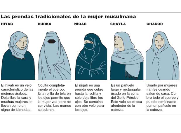 Con respecto al velo (en árabe, hiyab), el Islam adoptó una costumbre preislámica, propia de Oriente Medio. En el Nuevo Testamento, San Pablo ordena que la mujer debe cubrirse el cabello (1a de Corintios, 11: 5-8). El hiyab sólo oculta el pelo, al contrario que el burka, que la cubre totalmente. El niqab o el chador son prendas que surgen mucho después de la aparición del Islam, mientras que el burka tiene un origen preislámico y antes de convertirse en un símbolo de opresión contra la mujer, era empleado tanto por ellas como por varones para protegerse de los ardientes vientos del desierto. No debe relacionarse estas prendas con el mensaje original del Islam.